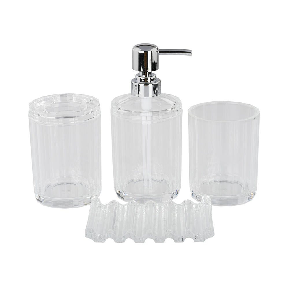 Luxe bathroom set / accessory crafted with transparent acrylic. Four pieces set is compact and light weight. Design to compliment to any bathroom. High quality, clean contemporary design- from Taiwan.