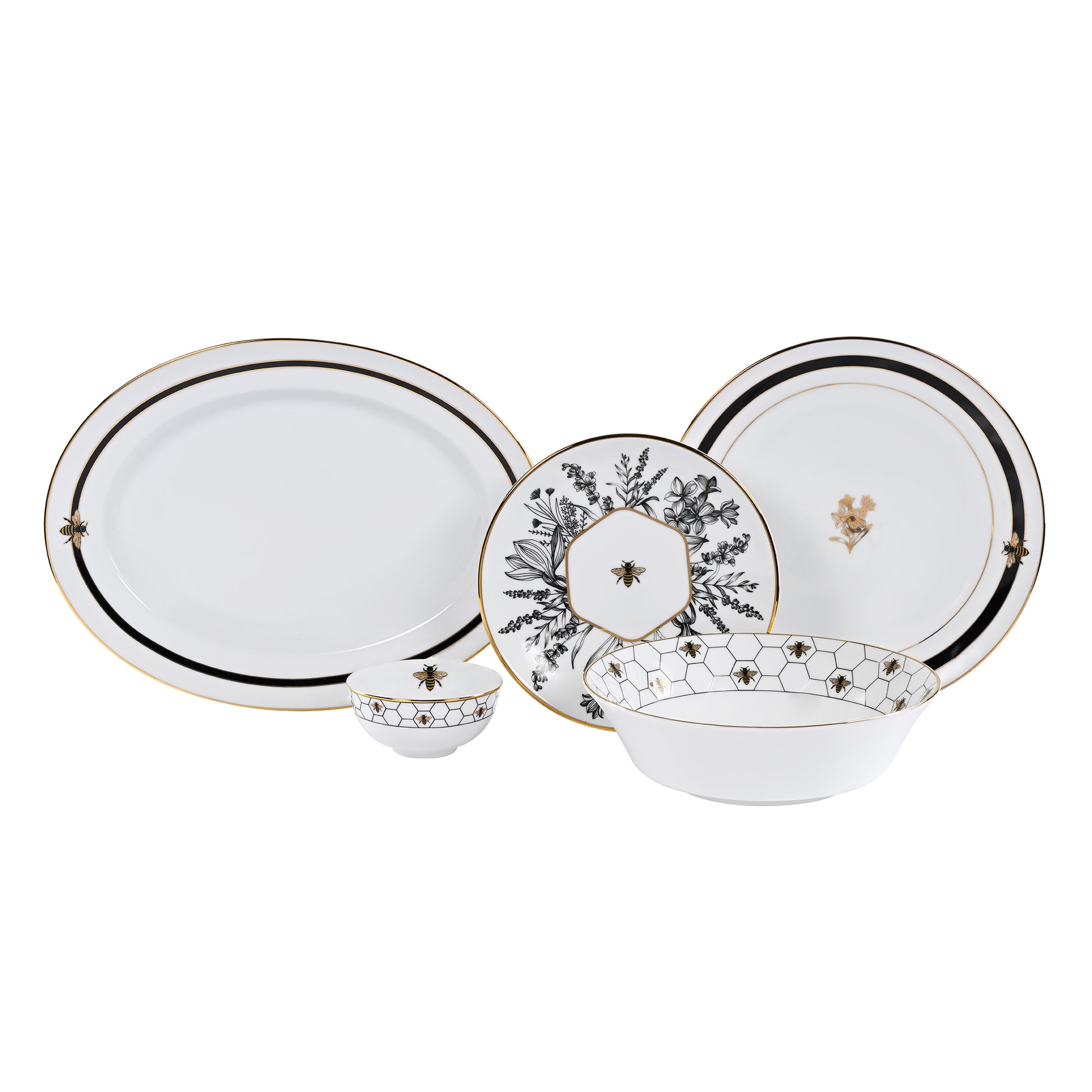 Bold. Refined. Timeless. The Bee Black 21-Piece Porcelain Dinner Set is a statement in modern luxury dining. Crafted from fine porcelain, each piece is highlighted with intricate bee-inspired detailing and finished with an elegant metallic rim for a touch of sophistication.
