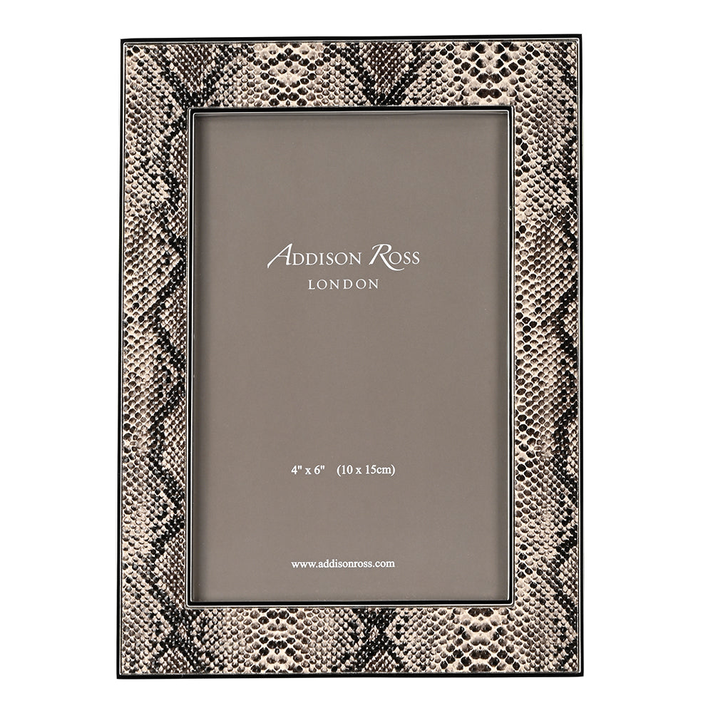 British made faux snake print photo frame with a modern silver trim looks elegant and stylish. Backed with luxury velvet and is able to stand both landscape and portrait. Apart from it's sophisticated look, it comes in a well packed box to make it a perfect gift for all occasions. Available in two sizes. Group them to make an impressive statement.