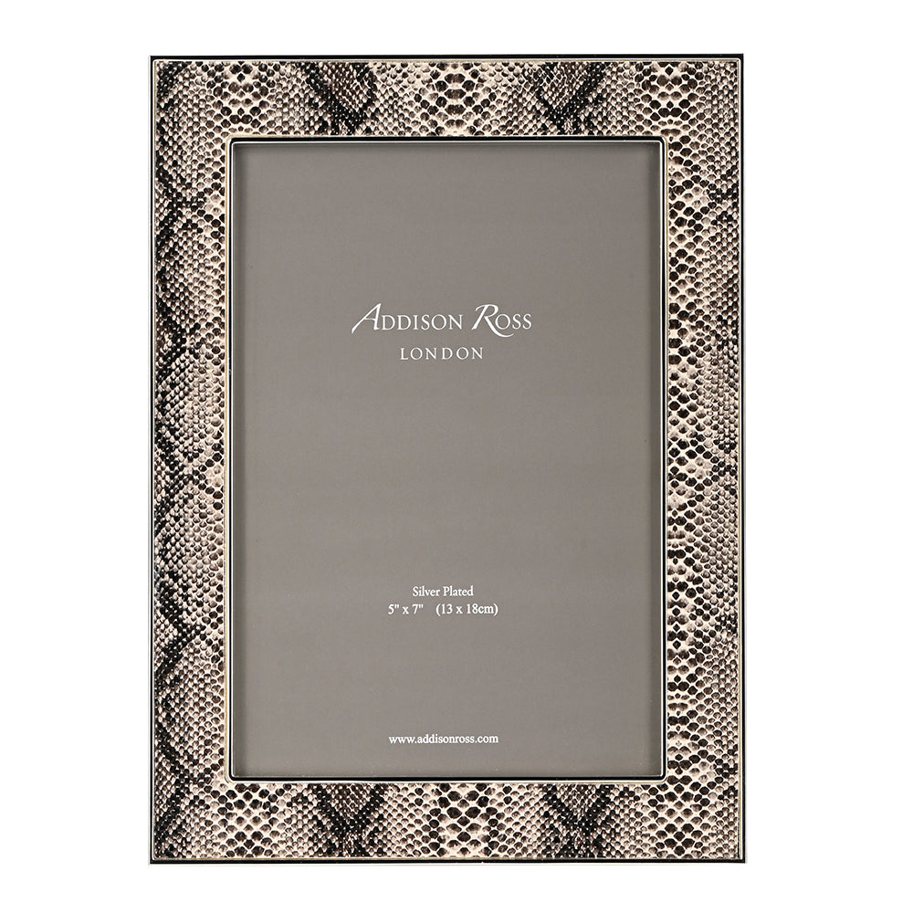 British made faux snake print photo frame with a modern silver trim looks elegant and stylish. Backed with luxury velvet and is able to stand both landscape and portrait. Apart from it's sophisticated look, it comes in a well packed box to make it a perfect gift for all occasions. Available in two sizes. Group them to make an impressive statement.