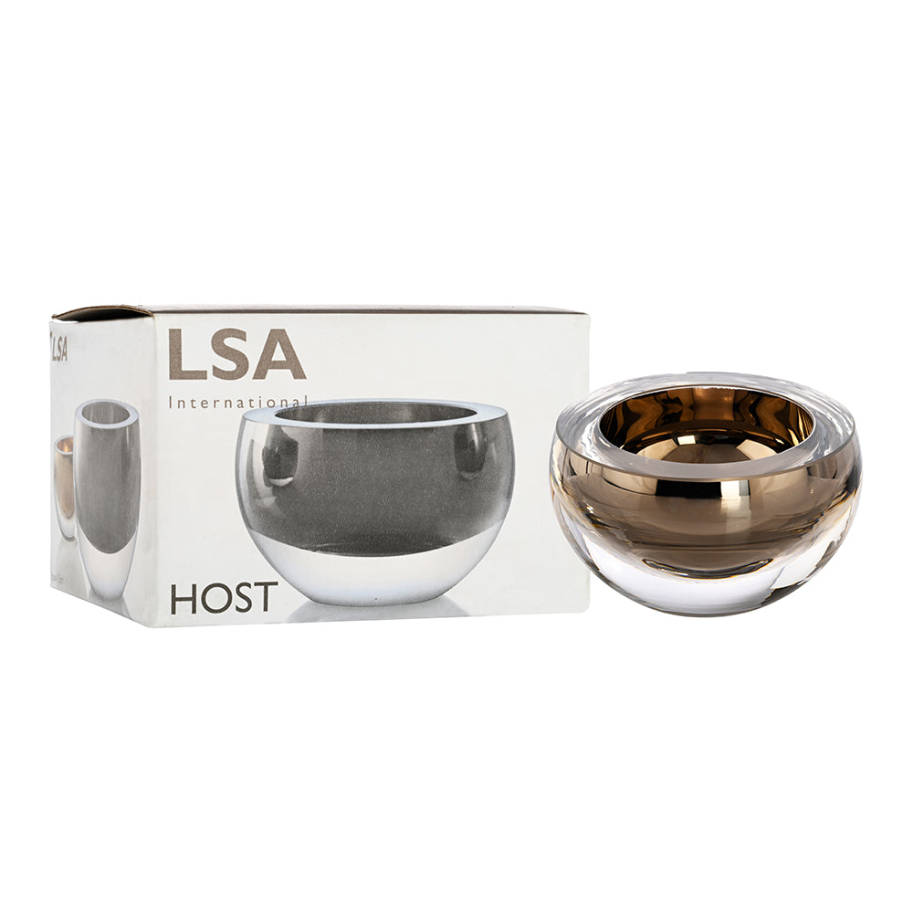 A curved, heavy glass bowl, mouth blown and hand finished by master glassblowers. The interior is painted by hand with real platinum. Display as a decorative object or use as a serving bowl for nuts or olives.