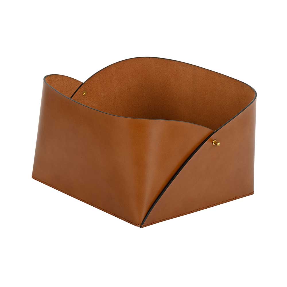 Artistically crafted light brown leather basket with metal detailing. Perfect for pairing as a decorative or multipurpose storage. Place them by your bedside, living room or study room to keep your space free of clutter with this high quality artfully made piece. Available in three sizes.