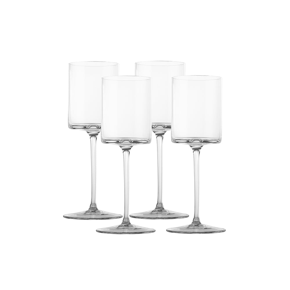 A set of two of mouth-blown wine glasses with cylindrical bowls and an angular, geometric profile.