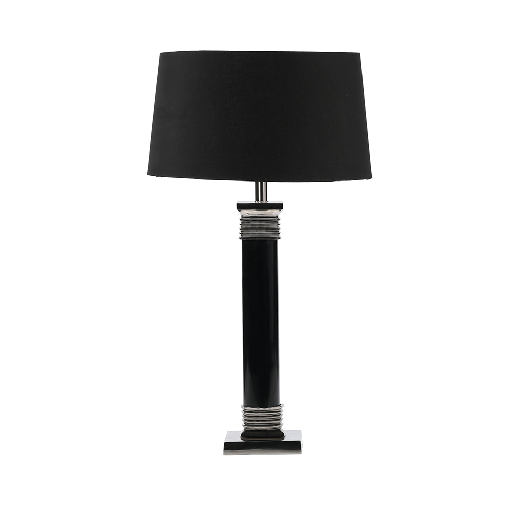 Pillar table lamp in antique brass finish. A bespoke black shade to complete the look. A statement design that adds sophistication to any room.