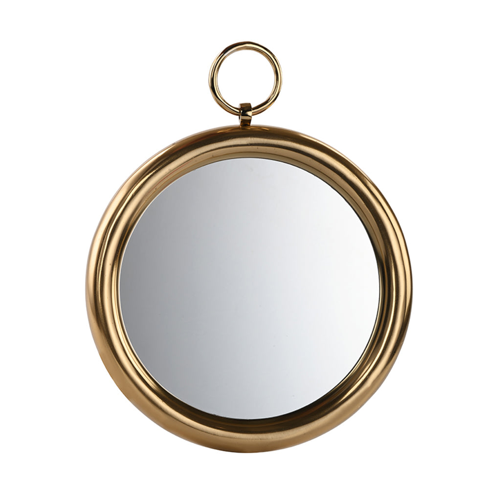 Gold and lacquer finish aluminum round mirror with ring. Versatile in use. Available in two sizes.