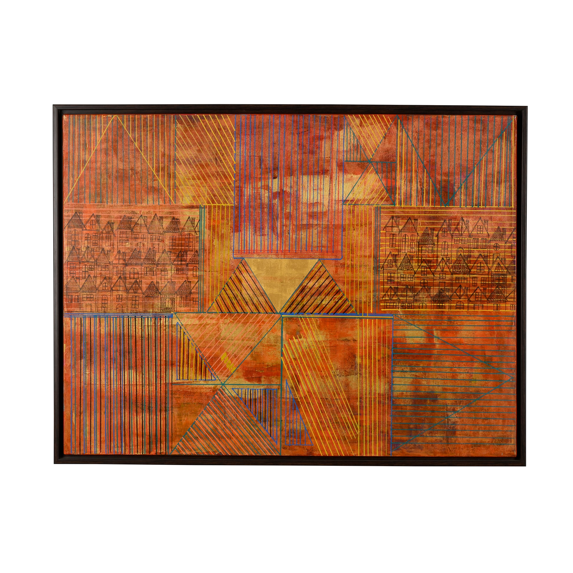 The Neighbourhood next door features a cluster of minimalistic townhouses surrounded by intricate geometric designs that ripple across the canvas. The townhouses stand as quiet silhouettes amidst dynamic interplay of colour and form, their simplicity contrasting with the vibrant abstraction surrounding them, it captures the essence of urban harmony and the hidden beauty in everyday life.