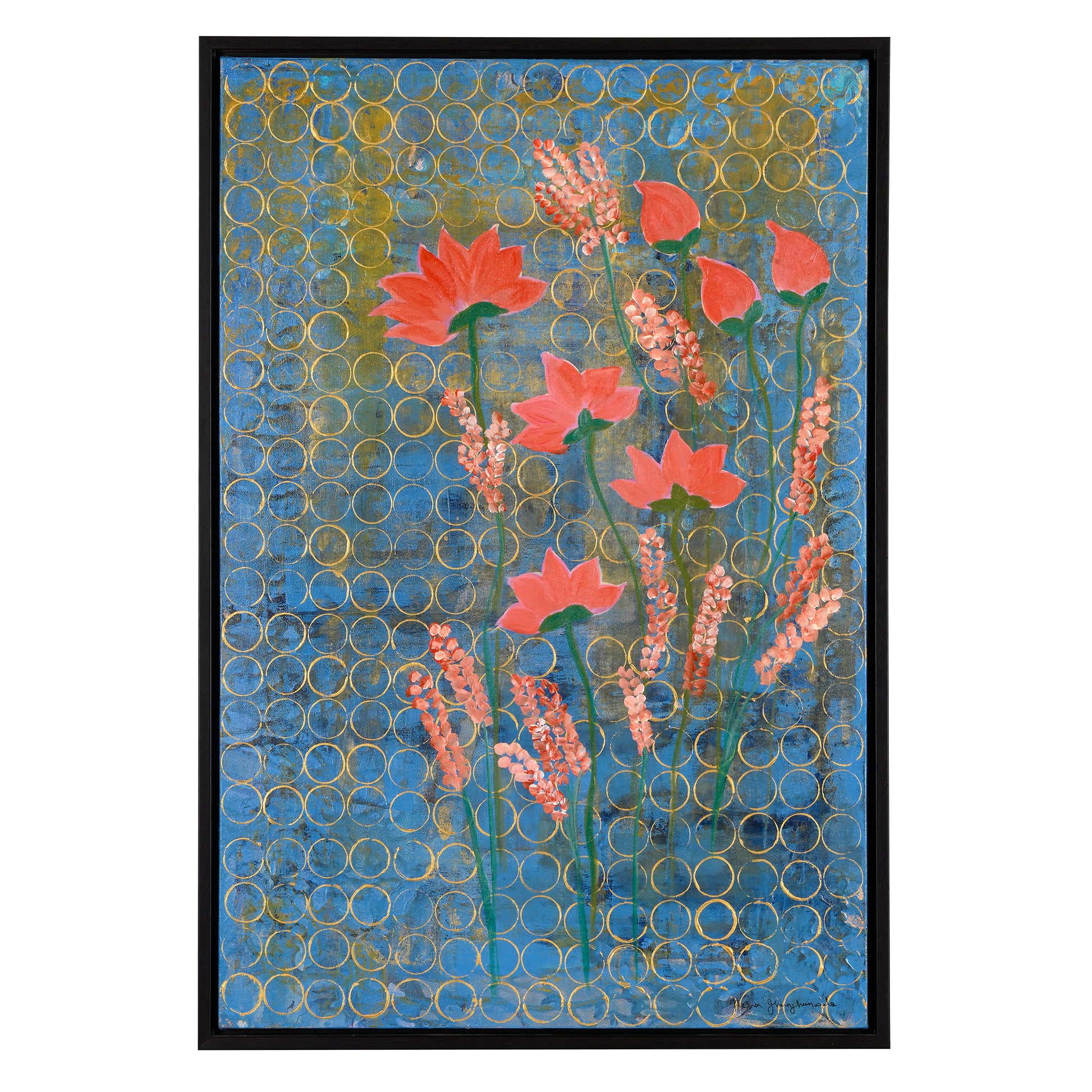 Winter Bloom is a serene acrylic painting in shades of blue with delicate circular patterns evoking snowfall and winters quiet rhythm. At its heart a bouget of lotus flower gracefully symbolizing resilience and purity among the cold.